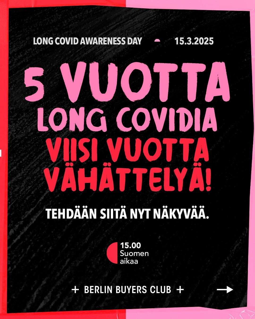 Kansainvälinen long covid -tietoisuuspäivä Long Covid Awareness Day tulee taas 15.3. Berlin Buyers Club järjestää Berliinissä mielenosoituksen, minkä lisäksi he kutsuvat kaikkia eurooppalaisia mukaan mielenilmaukseen samaan aikaan 15.3.2025. Suomen Covid -yhdistys kannustaa suomalaisia ottamaan osaa. Yhdessä voimme vaikuttaa voimakkaammin!
